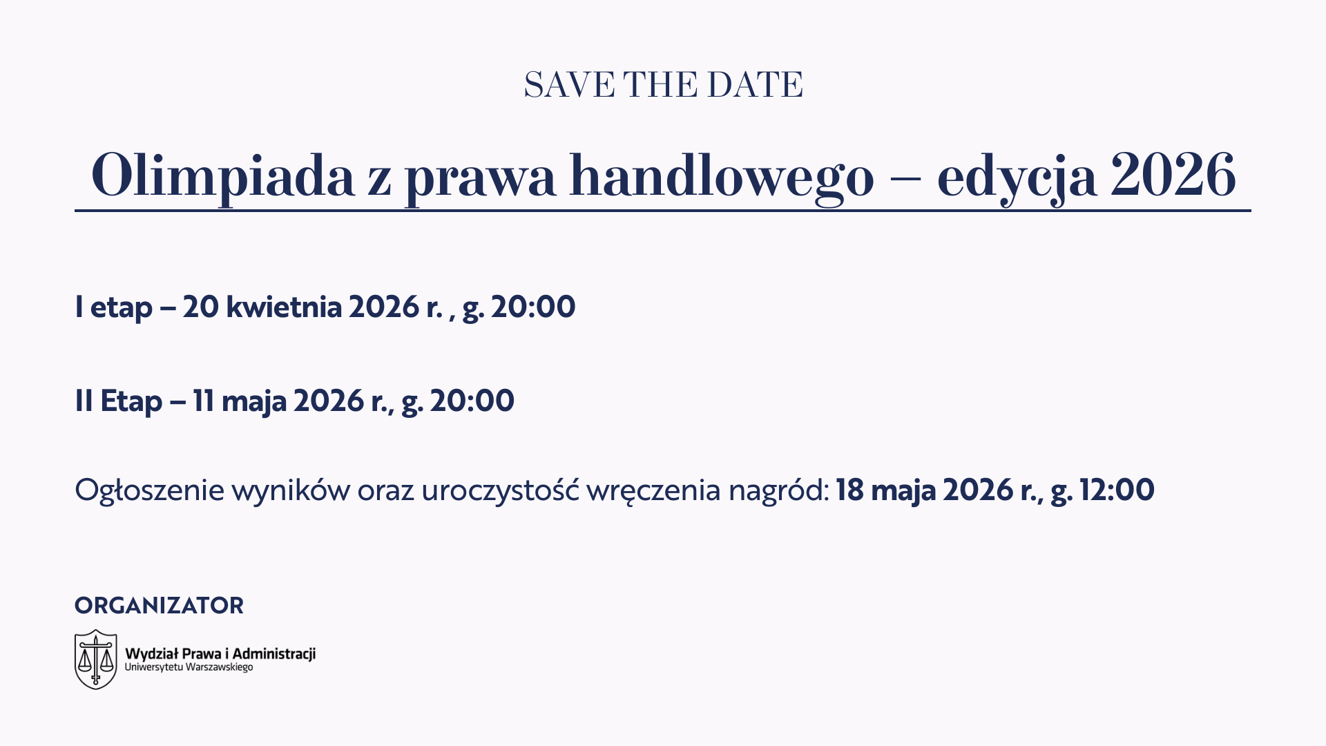 uprzejmie informujemy, że dnia 23.05.2022 r. o godzinie 12.00, w sali dziekańskiej (nr 209) w Collegium Iuridicum I odbyło się ogłoszenie wyników I edycji Olimpiady Przedmiotowej z Prawa handlowego oraz wręczenie nagród.